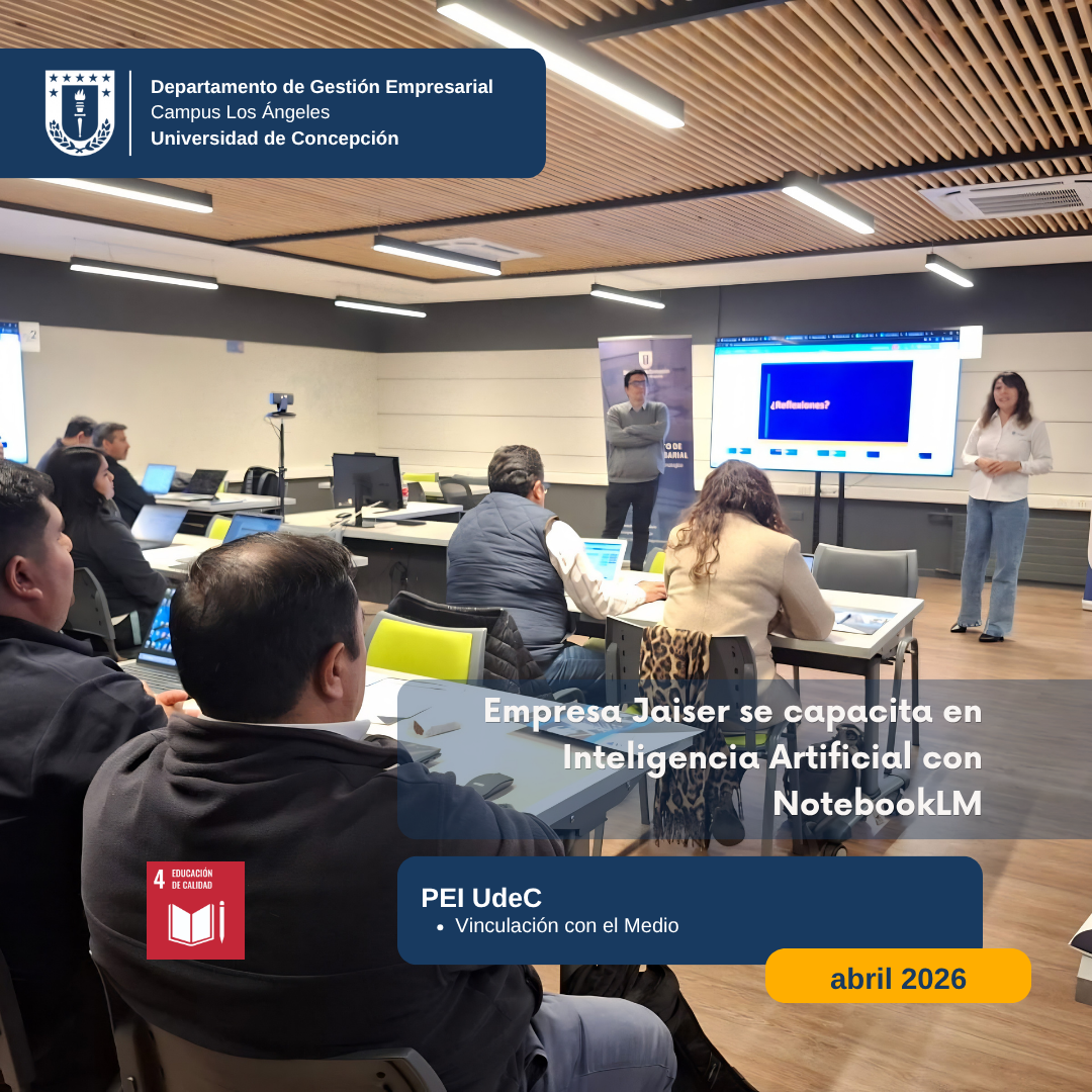 El pasado viernes 10 de abril, el Departamento de Gestión Empresarial de la Universidad de Concepción, Campus Los Ángeles, llevó a cabo un taller presencial dirigido a la empresa Jaiser. La instancia se centró en el uso de NotebookLM, una herramienta de Inteligencia Artificial diseñada para organizar, resumir y comunicar información crítica con el fin de mejorar la gestión organizacional.